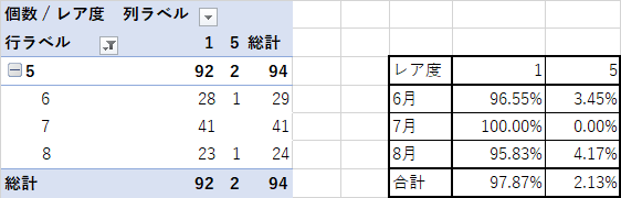5の孵化率1.43→2.13となったが実数値では孵化数2と同じ こちらも変化なし