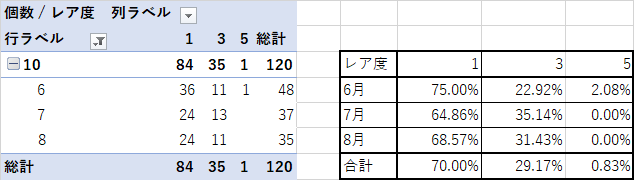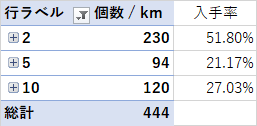 5kmの入手率が低いのはサンプル数が足りなくて偶然なっているのか。意図した調整なのかバグなのか。そこは不明な点として今後も調べていこうと思う。