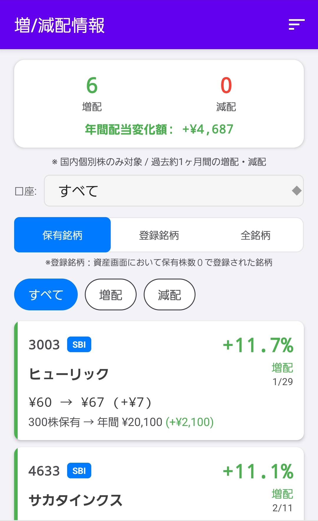 保有銘柄・登録銘柄・全銘柄それぞれで、増配・減配の情報が表示されるようになりました。